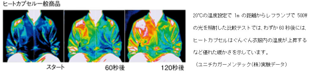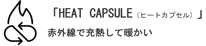 「ヒートカプセル」は、繊維表面及び繊維間に赤外線吸収剤を搭載。太陽光と人体、外と中から発する赤外線を熱に変え、繊維内に熱を閉じ込めます。この充熱システムが熱を効率良く蓄え、従来の防寒系素材に比べ“約+3℃”の衣服内温度の暖かさを実現します。