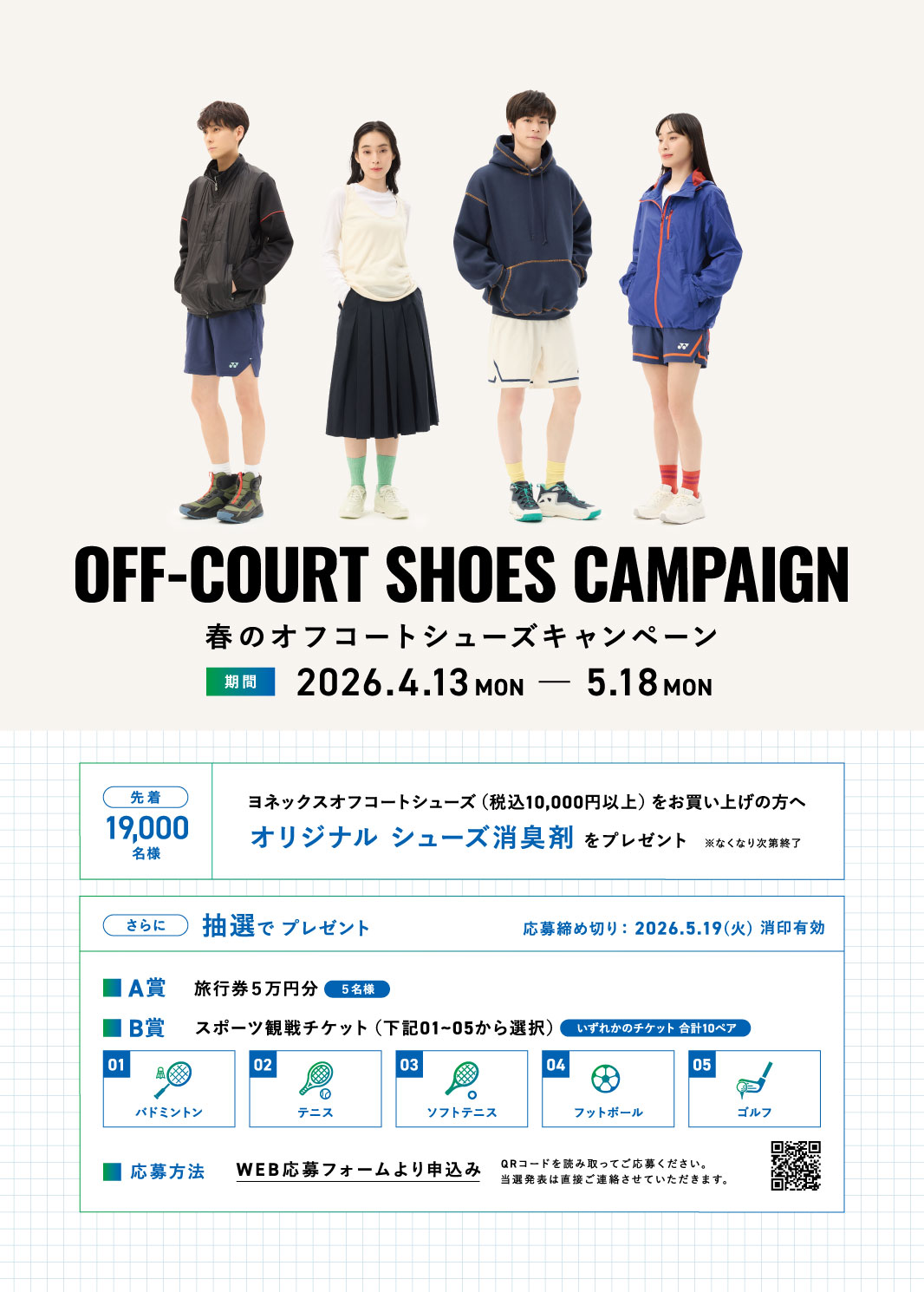 キャンペーン期間中、メーカー小売希望価格10,000円以上(税込)のオフコートシューズをお買い上げの方、先着19,000名様にオリジナルシューズ消臭剤をプレゼント。また、専用応募はがきによる申し込み、もしくは下記WEB応募フォームにて必須事項をご登録・応募いただいた方の中から抽選で5名様に旅行券5万円分(A賞)、10組20名様に「スポーツ観戦チケット」(B賞)をプレゼントいたします。