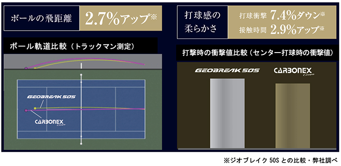 さらにストリングパターンは縦糸16本×横糸15本とし、従来品よりも横糸を1本削減。打球エリアのピッチ間隔を5%拡大することで、柔らかさと飛びを向上させました。