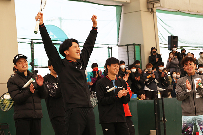 今回のイベントには国内トップ選手が一挙に10名が参加。船水颯人選手(稲門クラブ)、丸山海斗選手(Up Rise)のプロ選手、NTT西日本の日本代表ペアである内本隆文選手、内田理久選手、そして地元宇部市に拠点を置くUBEより河村侑哉選手、越智大輔選手など錚々たるメンバーが集まり、ソフトテニスを通してファンと交流しました。
