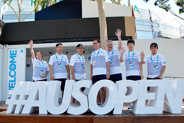ヨネックスストリンギングチームがオーストラリアンオープンで約1か月間にわたって選手をサポートします!(左から、カレン・グッドマン、中村伸治、ジュリアン・リー、マーク・マスフロフスキー、マーク・グッドマン、バーニー・チャン、キアン・ピンレイ)
