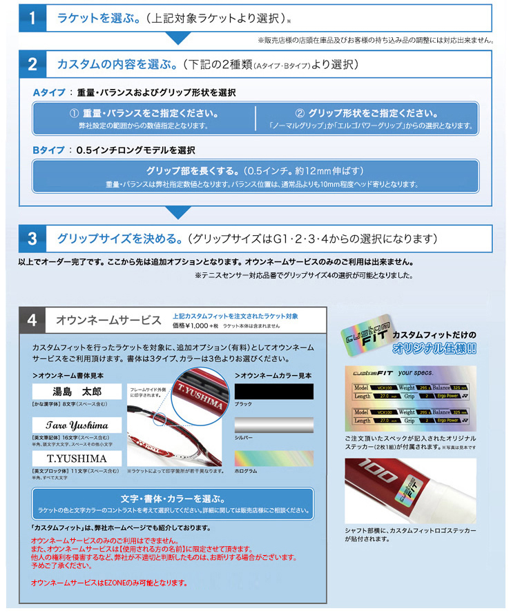 こだわりを持つプレーヤーを対象に、テニスラケットの重量・バランス・グリップ形状、またはラケット全長をお好みに合わせて指定できる「カスタムフィット」を是非、お試しください。