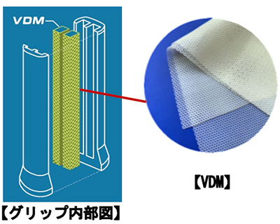 特殊なメッシュ状の新振動吸収素材「VDM」をグリップ部に内蔵。従来素材よりも広範囲にわたって使用することで、打ち負けない衝撃吸収性を実現しました。